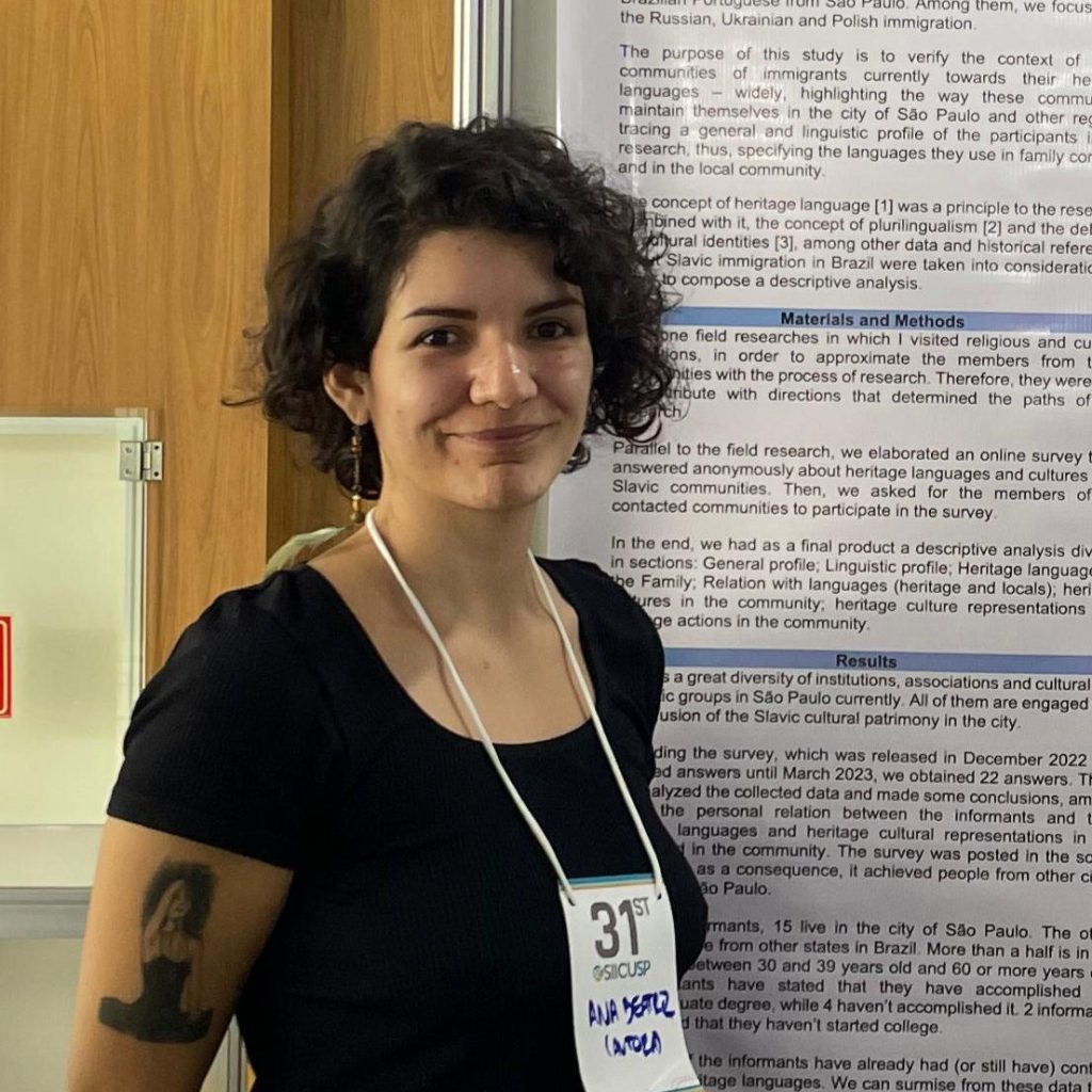 É graduada em Letras pela Faculdade de Filosofia, Letras e Ciências Humanas da Universidade de São Paulo (2024), com dupla habilitação em Português/Francês. Atuou como professora de inglês com abordagem comunicativa e intercultural e, atualmente, trabalha com tradução independente, revisão de textos e produção de resenhas. Entre 2022 e 2023, realizou uma pesquisa de iniciação científica na área de culturas e línguas de herança, com foco nas comunidades de imigração eslava e nas tradições russas, ucranianas e polonesas presentes na cidade de São Paulo.